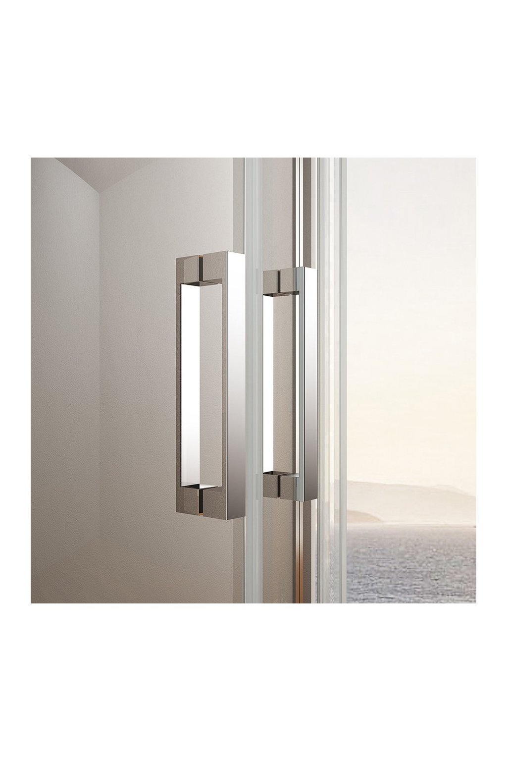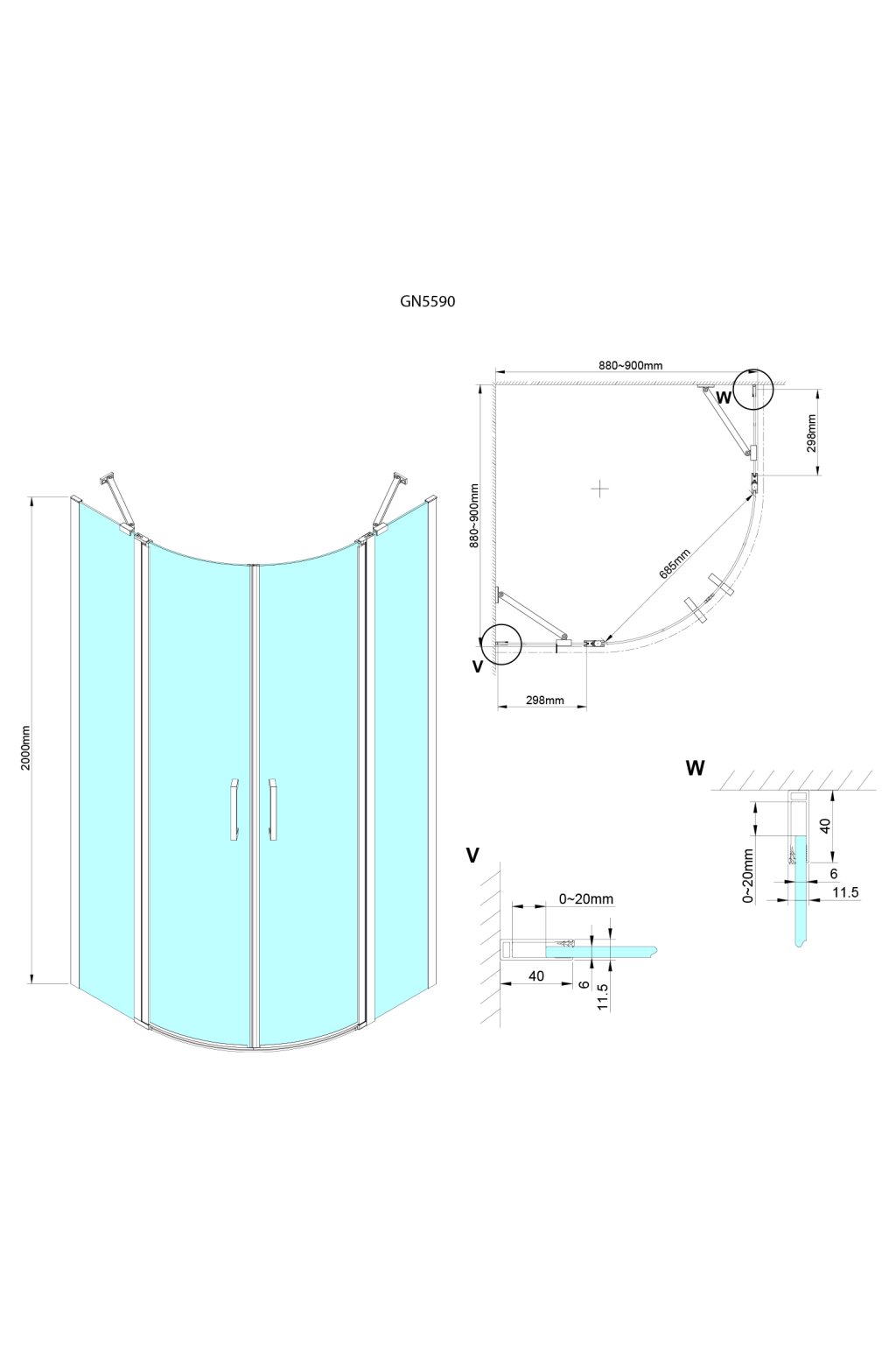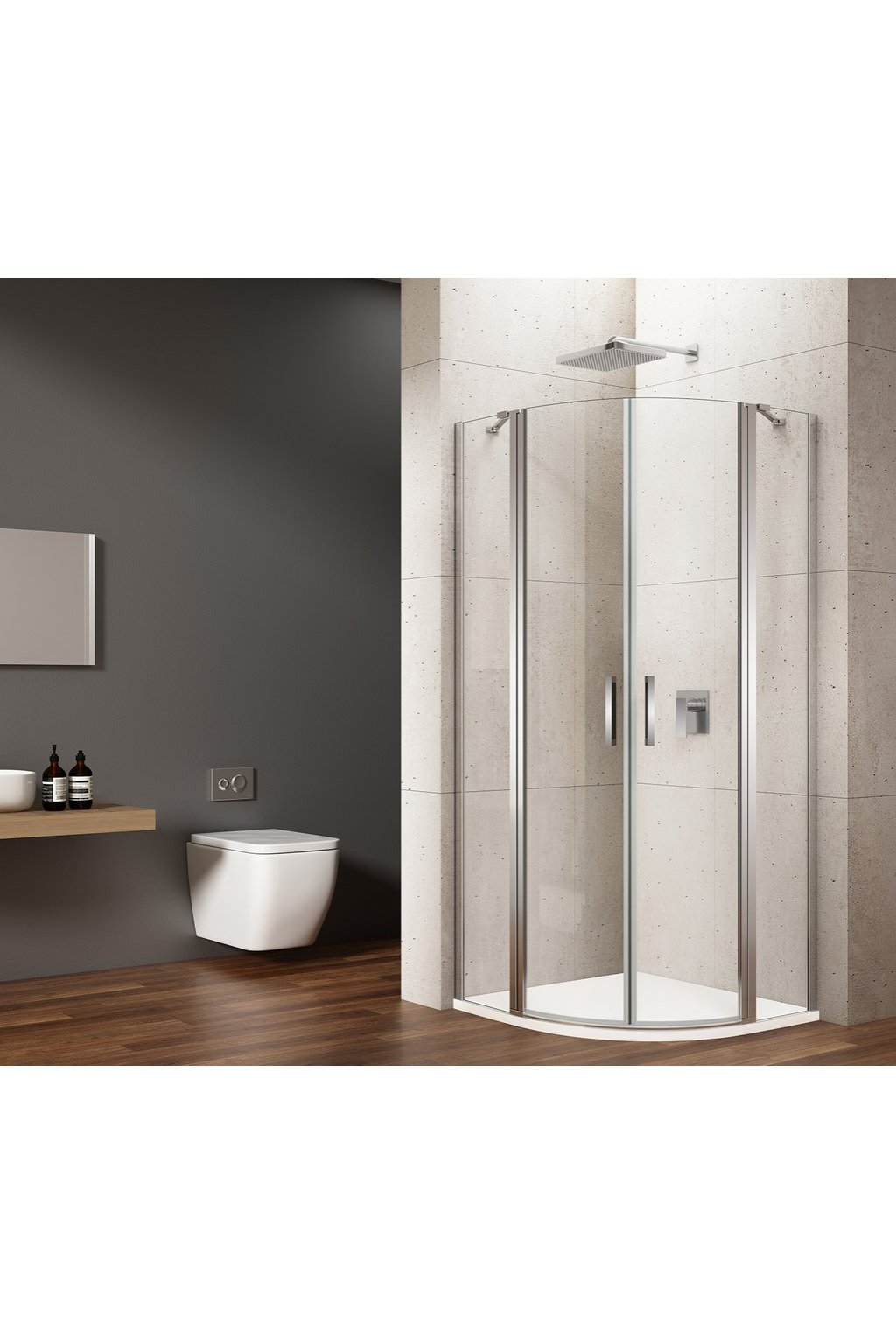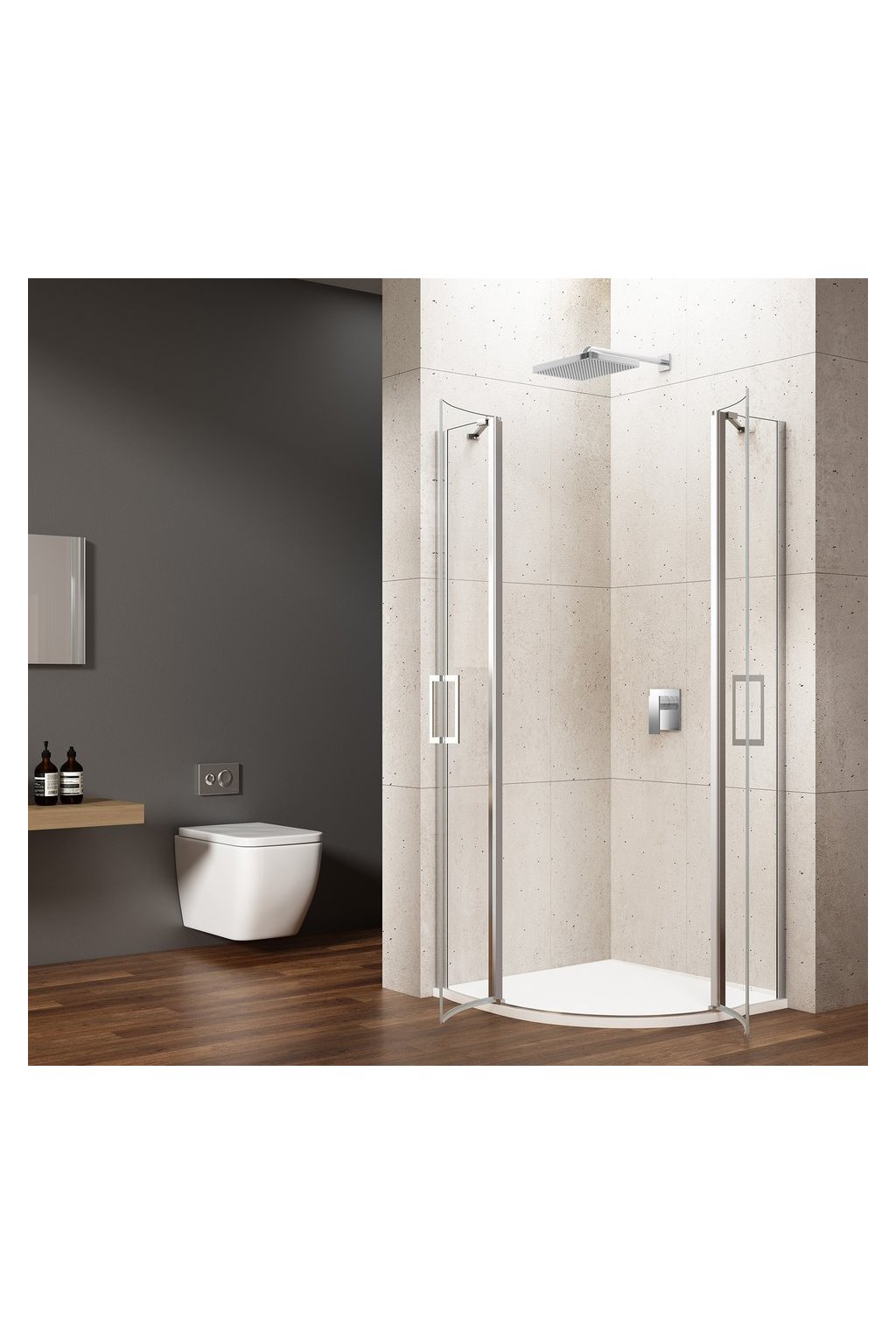 Čtvrtkruhová zástěna s dvoukřídlými dveřmi v rozměru 90x90 cm