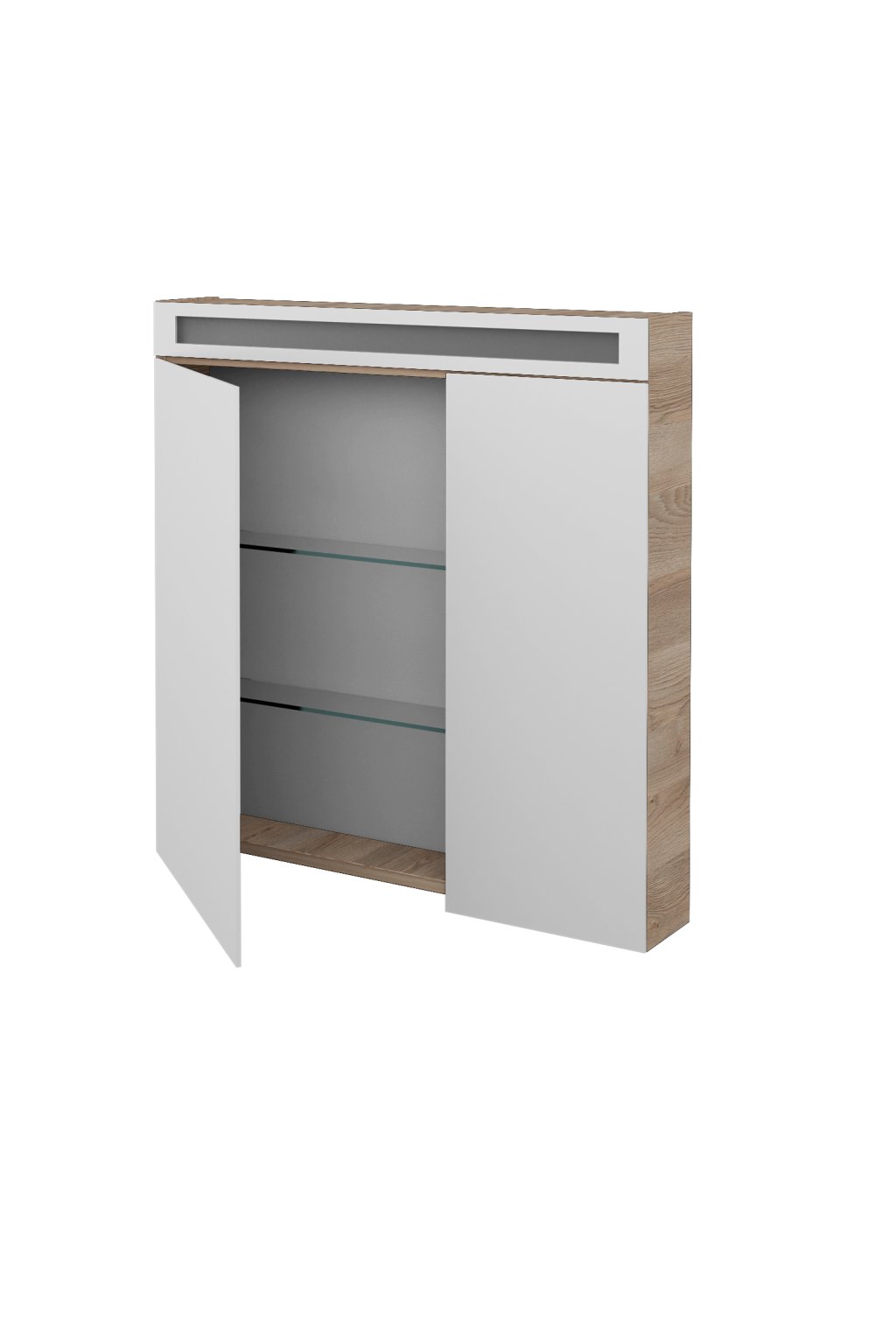 Koupelnová galerka AIR GA2NOE 80 - 50/30 je vyrobena z kvalitních LTD desek. Přední část této galerky je řešena oboustrannými otevíratelnými zrcadly, která jsou upevněna na značkových kovových pantech Grass. Zrcadla jsou k pantům přichycena pomocí speciální zrcadlové lišty (tato upevňovací technologie je chráněna českým patentem). Levá část zrcadla je široká 50 cm, pravá část má 30 cm. V horní části galerky je umístěno LED osvětlení, které velmi vhodně osvětluje i vnitřní prostor galerky. Uvnitř je v pravé části umístěna jedna elektrická zásuvka 230 V včetně vypínače osvětlení. Vnitřní uspořádání galerky AIR je řešeno dvěma skleněnými poličkami. Tyto poličky lze umístit v šesti různých výškově nastavitelných pozicích.