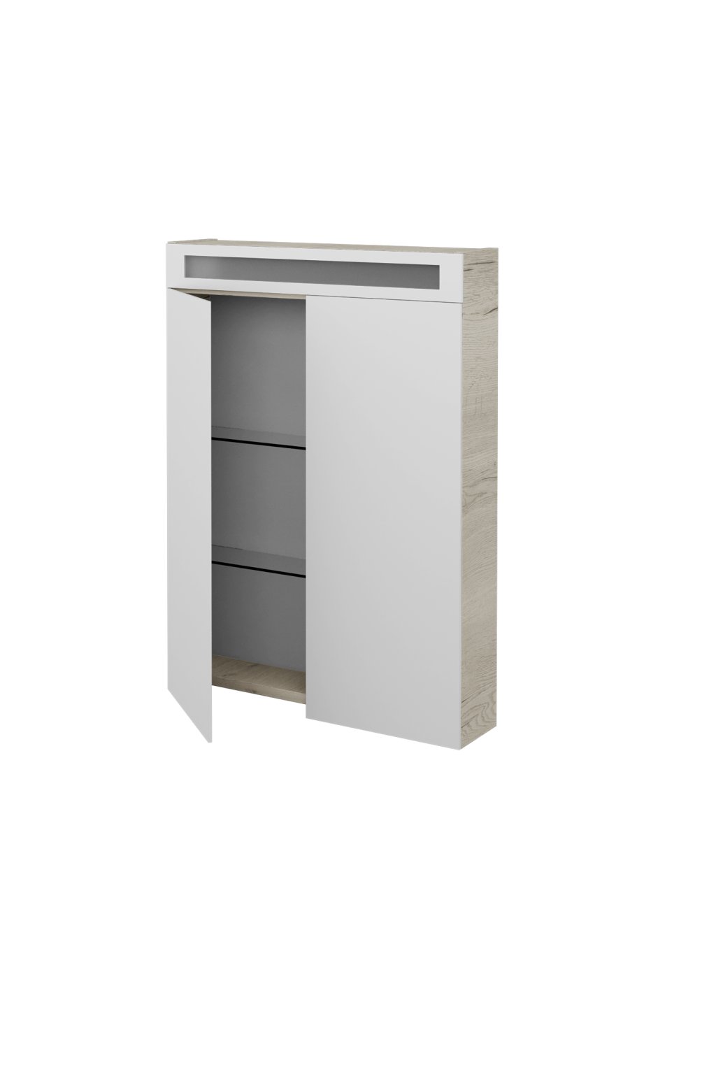 Integrované LED osvětlení je překryto mléčným pískovaným sklem a jeho výkon 11,5 W zajistí dostatečné osvětlení i v prostorných koupelnách. Galerka je navíc osvětlena i uvnitř a příjemně tak prosvětluje skleněné police. Světlo se pohodlně ovládá vypínačem ve spodní části galerky a uvnitř najdete i elektrickou zásuvku (230 W), díky které bude vysoušení vlasů či holení pohodlnější. Galerka splňuje krytí IP 44.