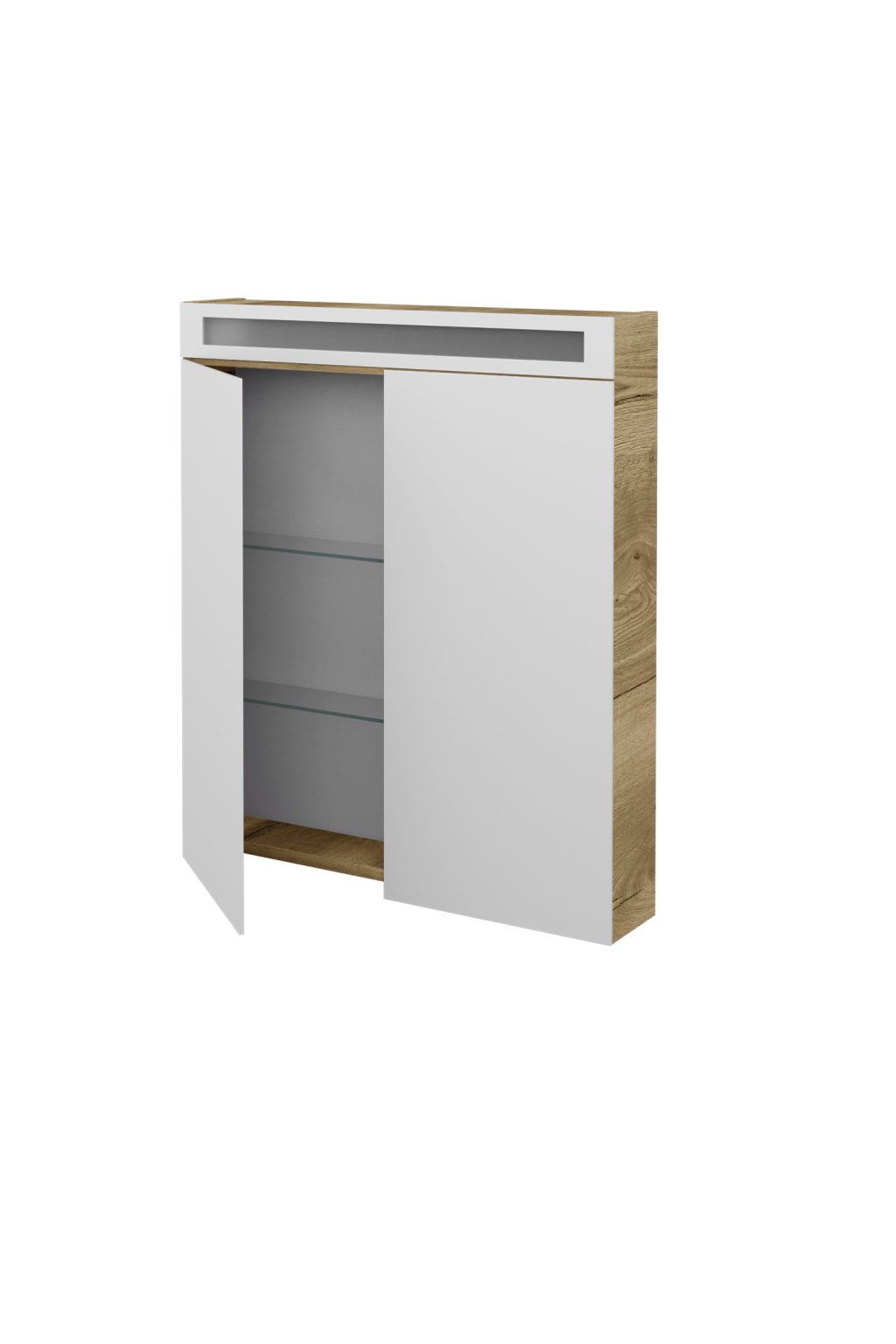 Integrované LED osvětlení je překryto mléčným pískovaným sklem a jeho výkon 13,4 W zajistí dostatečné osvětlení i v prostorných koupelnách. Galerka je navíc osvětlena i uvnitř a příjemně tak prosvětluje skleněné police. Světlo se pohodlně ovládá vypínačem ve spodní části galerky a uvnitř najdete i elektrickou zásuvku (230 W), díky které bude vysoušení vlasů či holení pohodlnější. Galerka splňuje krytí IP 44.