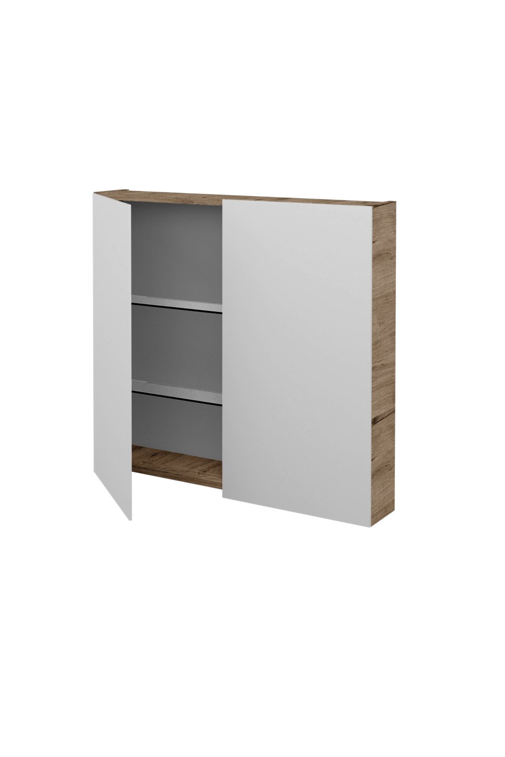 Dvoudveřová zrcadlová skříňka PREMIUM GA2E 80 kombinuje elegantní a střídmý design s konstrukcí vhodnou do vlhkých prostor. Oboustranně zrcadlová dvířka poskytují dostatek odrazové plochy a umožňují pohodlné využití z různých úhlů. Dvířka jsou osazena panty značky Hettich, z jedné strany upevněn na speciální liště a na druhé straně na korpusu galerky. Otevírání galerky je pohodlně řešené přesahem v dolní části zrcadloviny, dovírání pak usnadňuje kování, díky kterému je velice pohodlné a tlumené.