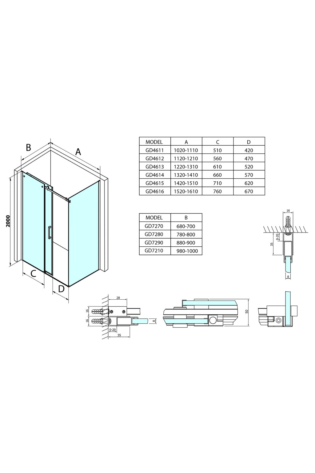 Kombinací dveří a boční pevné stěny lze získat obdélníkovou zástěnu 1200 x 700, 1200 x 800, 1200 x 900 mm nebo 1200 x 1000 mm.