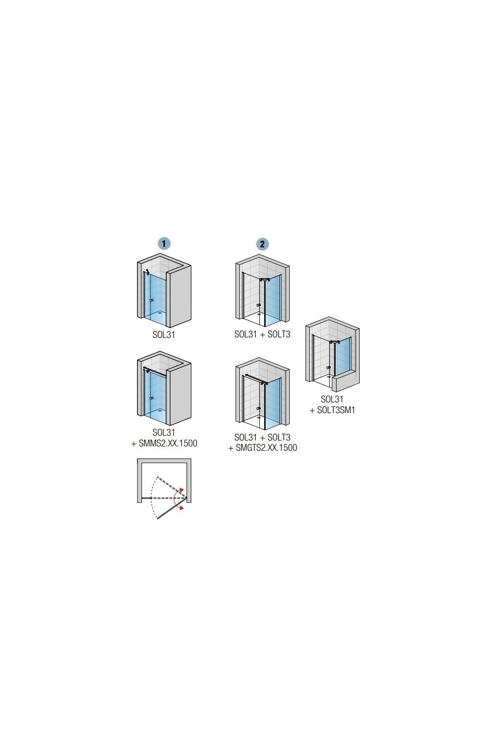 Sprchové dveře lze instalovat do niky, nebo kombinovat s boční stěnou v 90° SOLT3 a vytvořit tak čtverec/obdélník.
