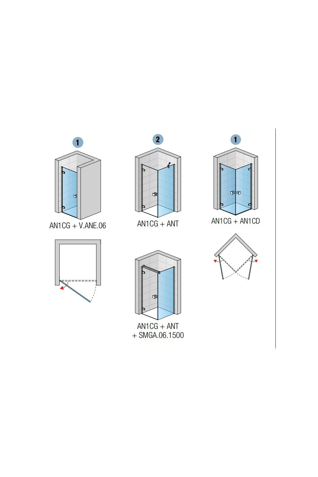 Kombinací dílů AN1C D (pravý díl) a AN1C G (levý díl) vznikne čtvercový nebo obdélníkový kout v šířkách od 70 do 100 cm s rohovým vstupem.