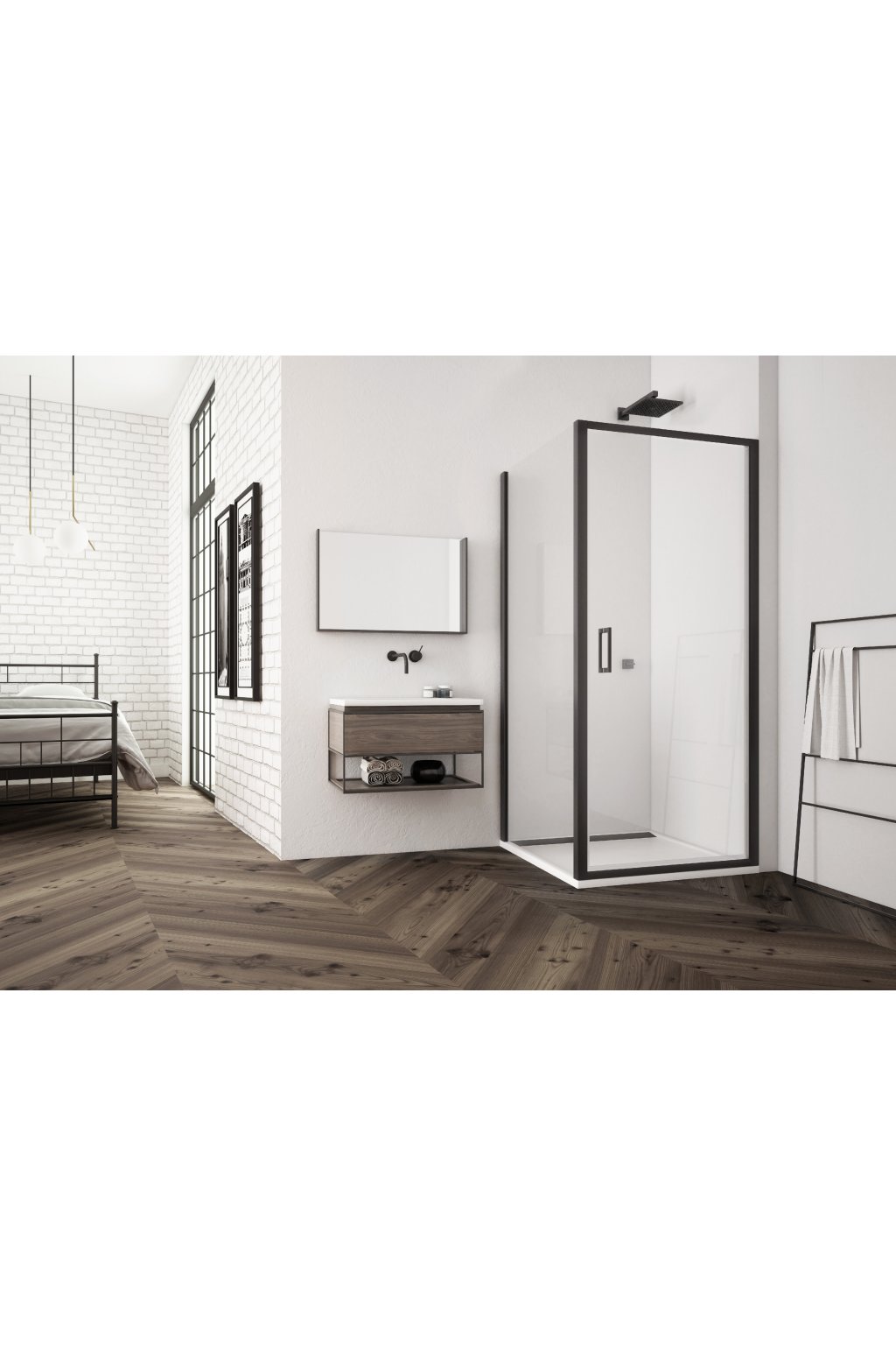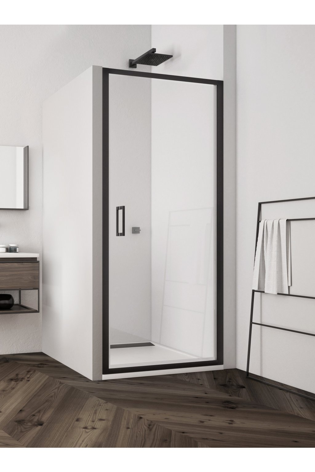 6mm bezpečnostní sklo s antiplakovou úpravou Aquaperle. Otvírání ven i dovnitř. Magnetické těsnění. Výška 2000 mm. Barva 06 černá matná. Sklo 07 čiré.