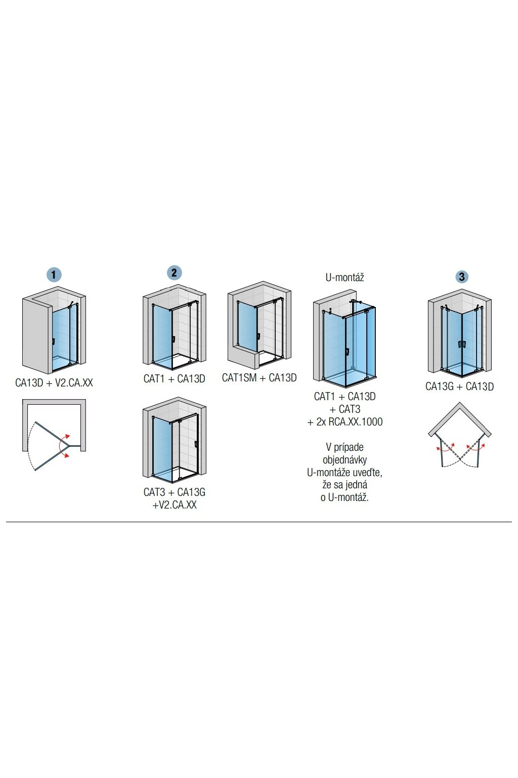 Jednokřídlé dveře s pevnou stěnou v rovině CA13 lze instalovat do niky, nebo kombinovat s boční stěnou v 90° CAT1 či CAT3 a vytvořit tak čtverec/obdélník.