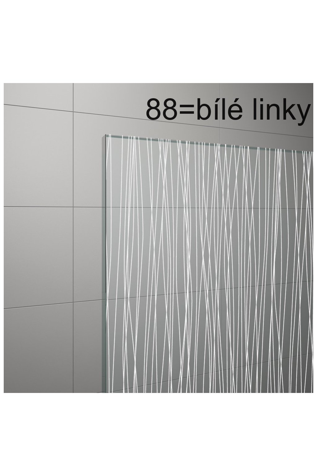 6mm bezpečnostní sklo. Magnetické těsnění. Výška 2000 mm. Barva 50=aluchrom. Sklo 07=čiré, 22=Durlux, 87=Screen nebo 88=bílé linky. Antiplaková úprava skla.