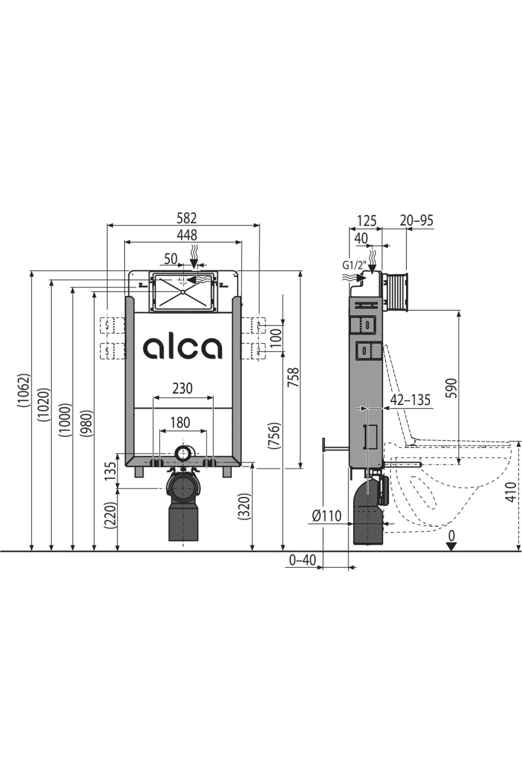 Předstěnový instalační systém pro zazdívání, s dávkovačem WC tablet, rozměry 582x1062x125 mm, přívod vody zezadu/shora G 1/2", objem nádrže 9 l, splachování velké/malé - 9/6 l, funkční rozsah tlaku vody 0,05 – 1,6 MPa.